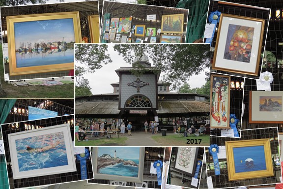 The annual All Island Art Show took place again at the MVCMA Campgrounds in Oak Bluffs on Monday, August 7, 2017. The weather held through the day resulting in another spectacular event. Over 60 artists showed their works around the Tabernacle including works in various painting media, collage, mixed media, drawing, photography and sculpture. It was a festive time with many visitors throughout the day enjoying the fabulous artwork displayed around the Tabernacle and for sale at the many portfolios around the periphery.
