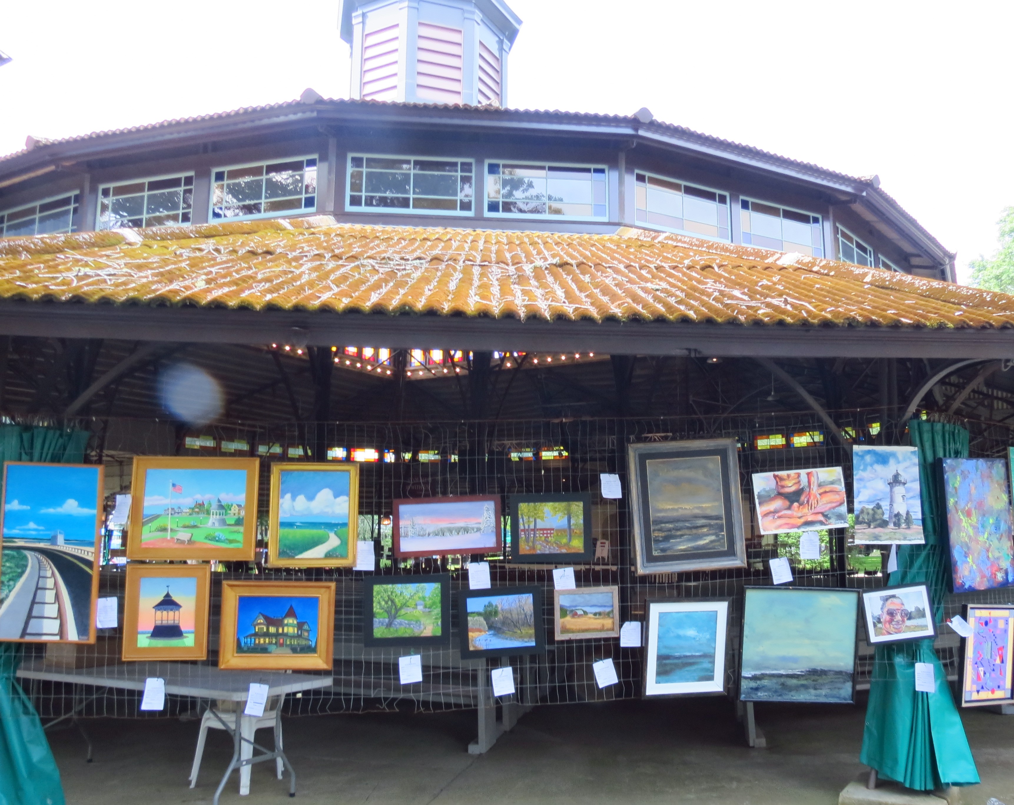 The annual All Island Art Show took place again at the MVCMA Campgrounds in Oak Bluffs on Monday, August 7, 2017. The weather held through the day resulting in another spectacular event. Over 60 artists showed their works around the Tabernacle including works in various painting media, collage, mixed media, drawing, photography and sculpture. It was a festive time with many visitors throughout the day enjoying the fabulous artwork displayed around the Tabernacle and for sale at the many portfolios around the periphery.